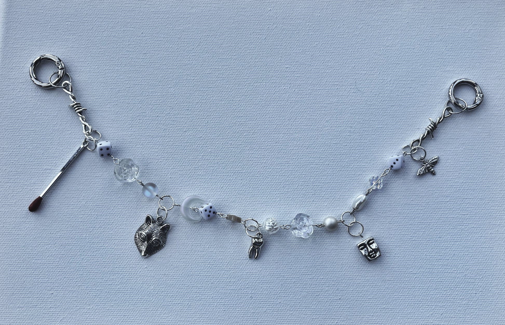 Playful and versatile—this silver-plated charm chain can be used on bags or as a belt loop accessory, featuring a mix of whimsical beads and charms.