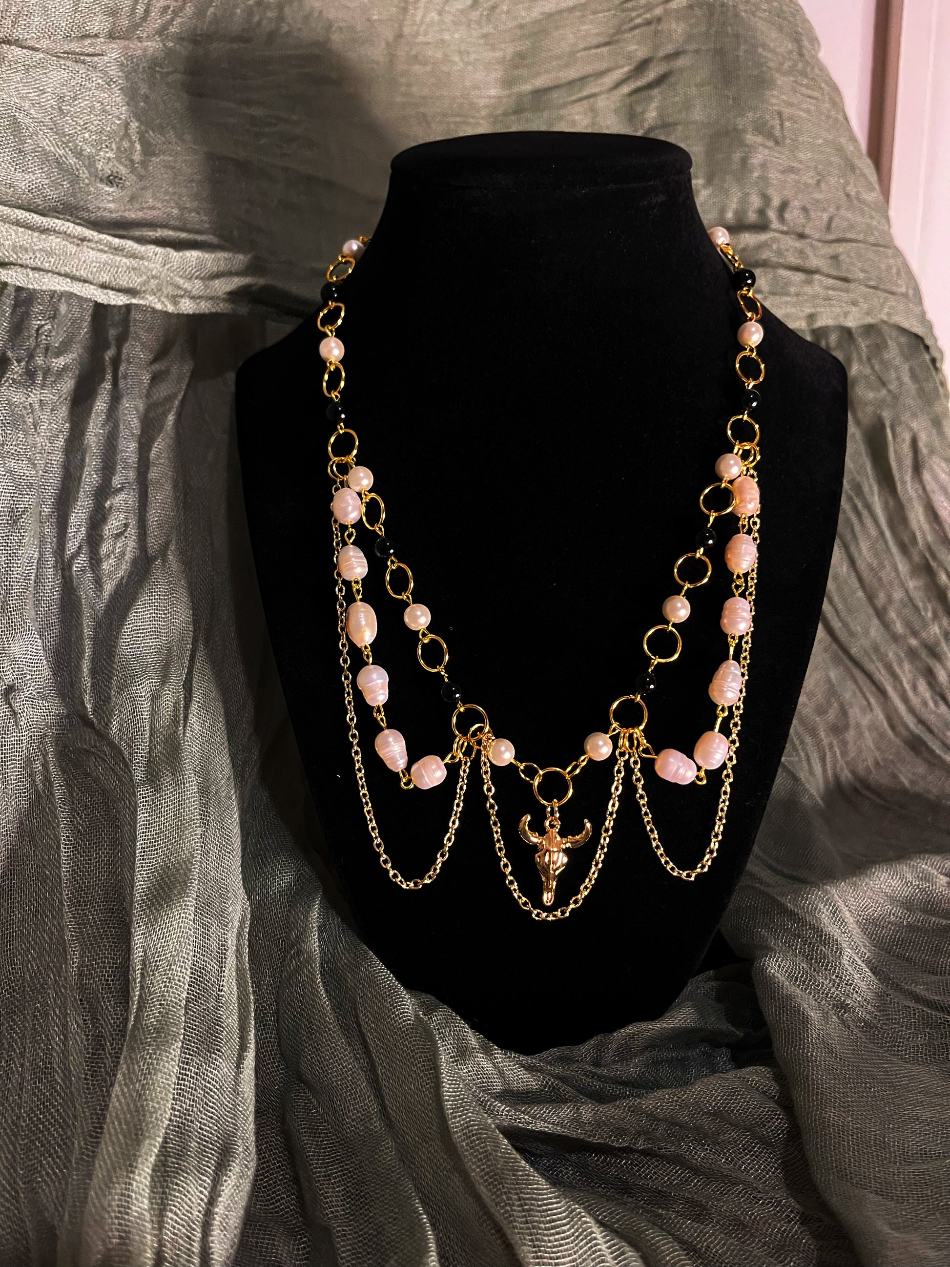 Black and white glass beads balance with freshwater pearls and layered golden chains. At the center, a bold bull head charm makes this necklace a statement of strength and elegance.