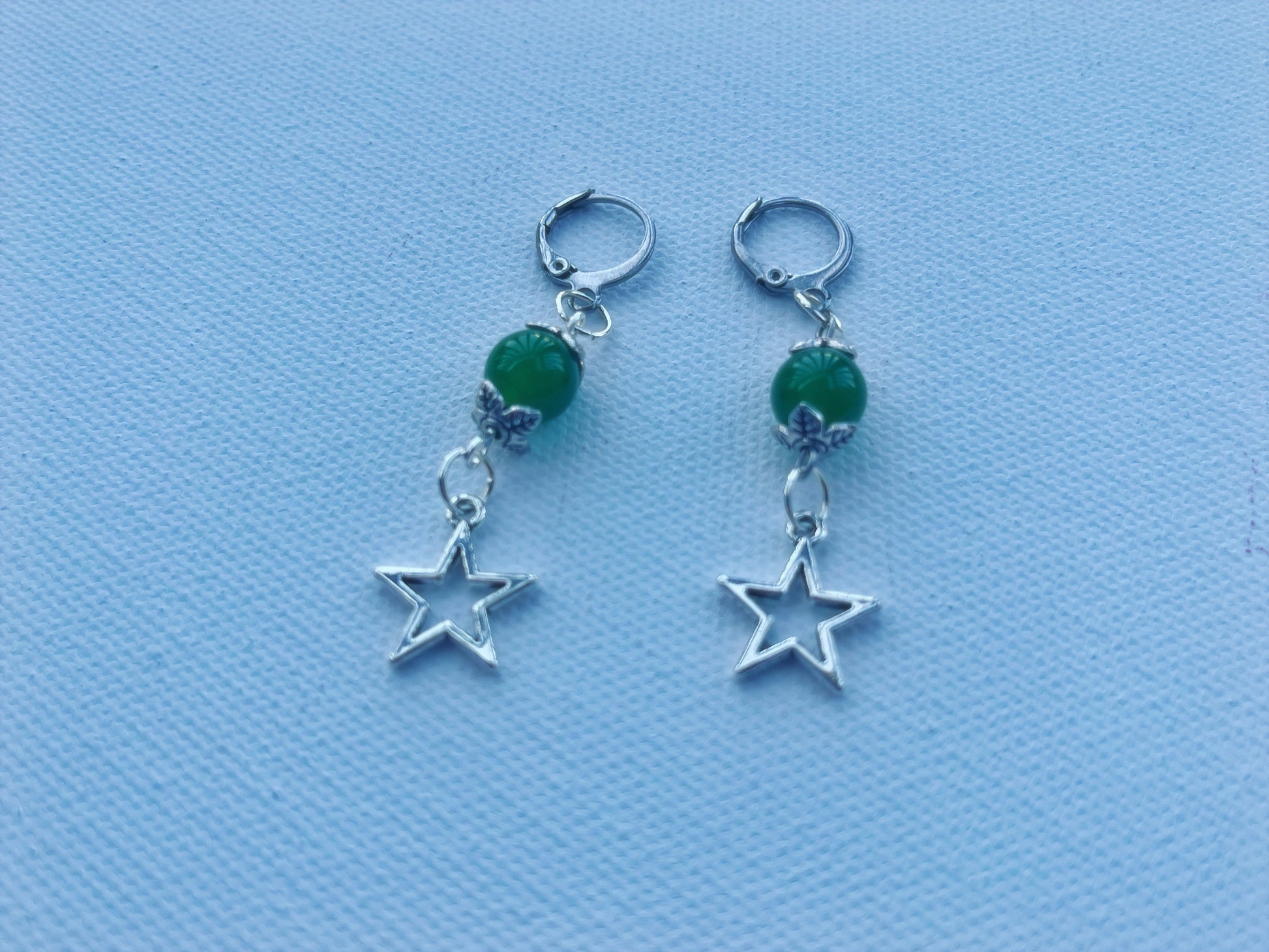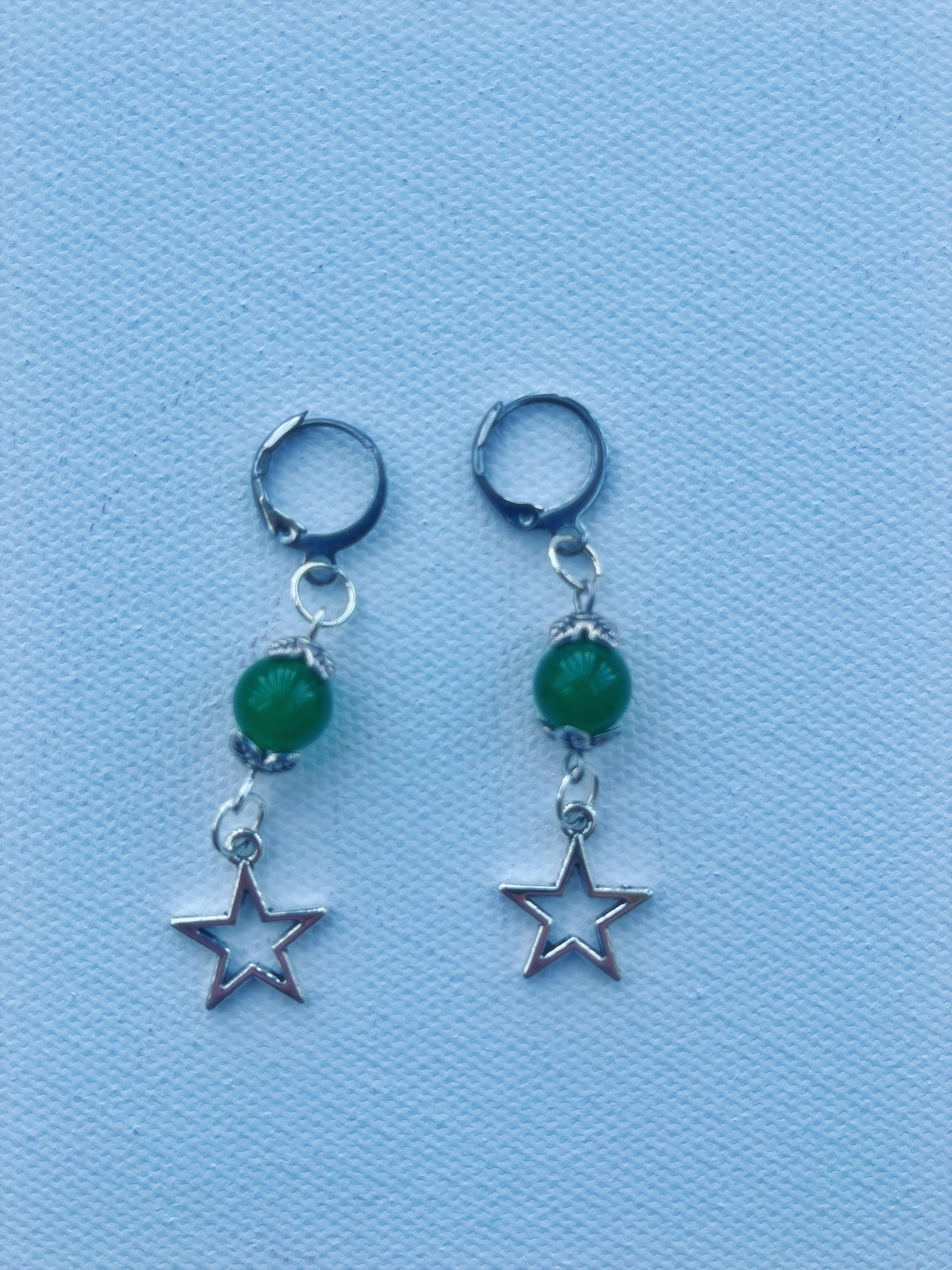 These sterling silver hook earrings combine a clean, minimalist look with a touch of celestial charm. Featuring bright green glass beads and silver-plated star charms, they bring a subtle shimmer that works beautifully for both everyday wear and special occasions.