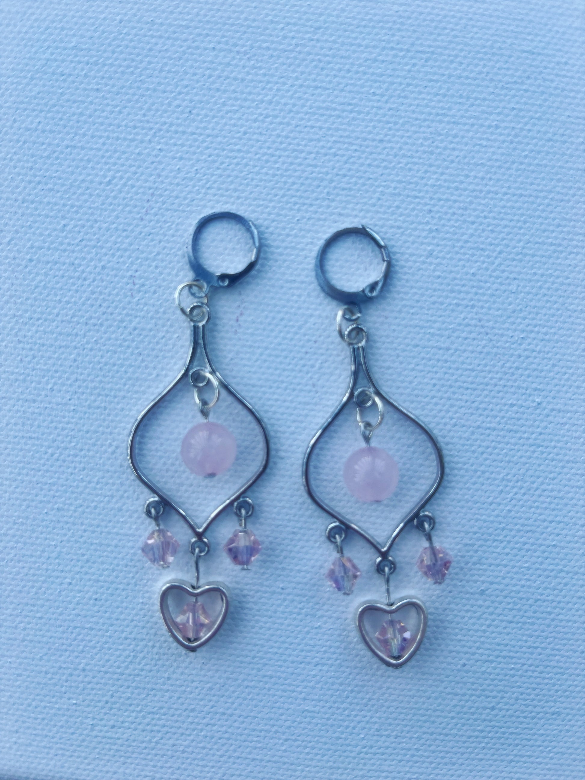Soft, romantic, and full of gentle charm. These sterling silver hook earrings feature natural rose quartz beads paired with sparkling pink diamond-cut glass beads. One bead is set inside a silver heart charm for a sweet, elegant touch. Lightweight and easy to style, these earrings bring a soft blush of color to any outfit.